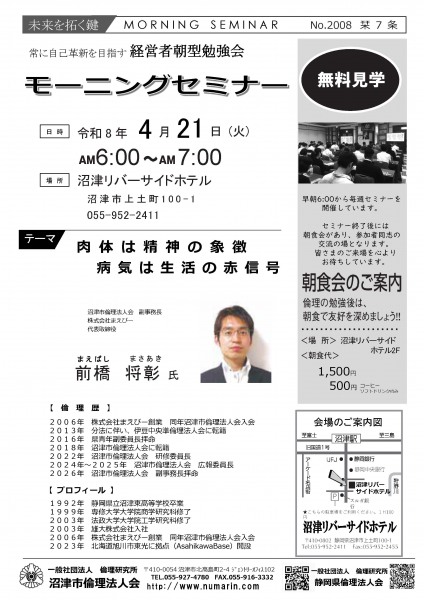 | 04月21日 | 前橋 将彰 氏 | 沼津市倫理法人会 副事務長、(株)まえびー 代表取締役 肉体は精神の象徴、病気は生活の赤信号 |