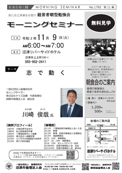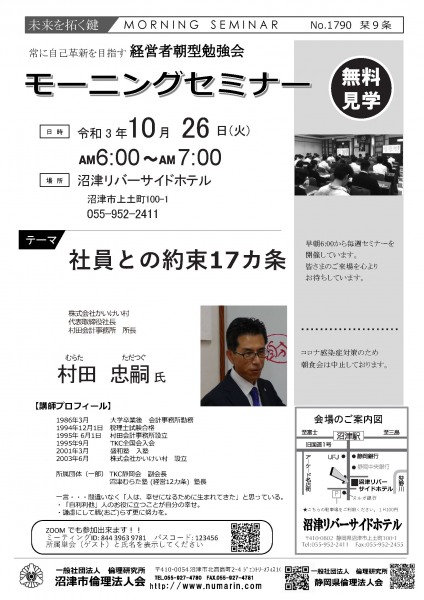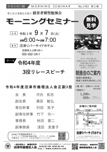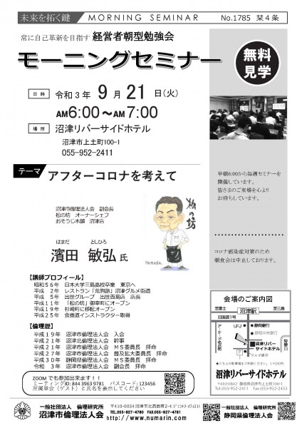 | 09月21日 | 濱田敏弘 氏 | 沼津市倫理法人会 副会長 アフターコロナを考えて |