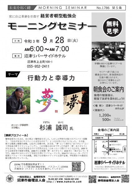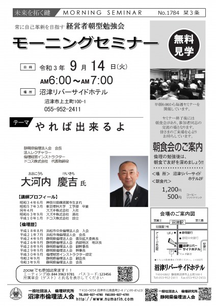 | 09月14日 | 大河内 慶吉 氏 | 静岡県倫理法人会 会長, ドコス株式会社 代表取締役 やれば出来るよ |