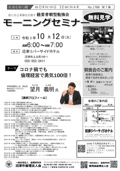 | 10月12日 | 望月 義明 氏 | 静岡県倫理法人会 副会長、(株)アスナロカン 代表取締役 コロナ渦でも倫理経営で勇気100倍 |