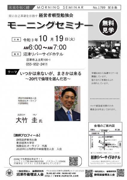 | 10月19日 | 大竹圭 氏 氏 | 伊豆中央倫理法人会 会員、(有)オーライフ 代表取締役 いつかは来ないが、まさかは来る~20代で倫理を選んだ志~ |