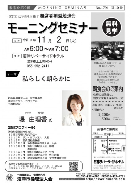 | 11月02日 | 堤 由理香 氏 | 静岡県倫理法人会 女性委員長 株式会社サン・ラファエル 代表取締役 私らしく朗らかに |