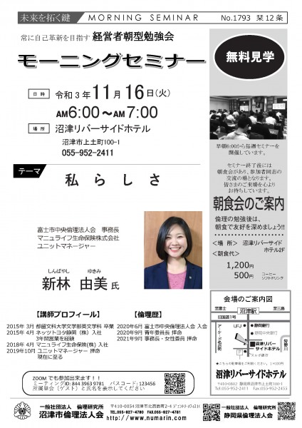 | 11月16日 | 新林 由美 氏 | 富士中央倫理法人会 事務長 マニュライフ生命保険(株) ユニットマネージャー 私らしさ |