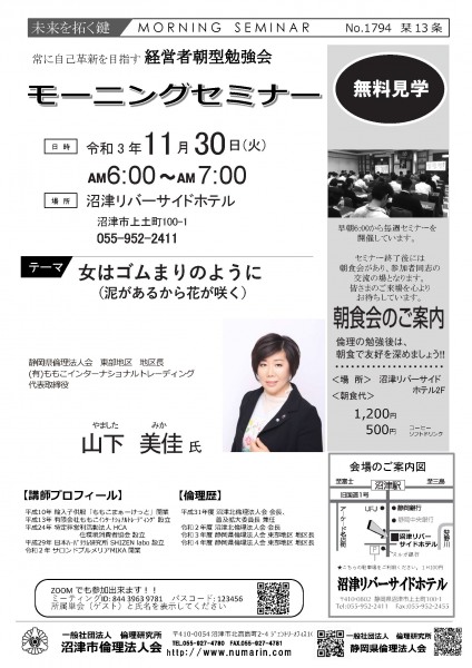 | 11月30日 | 山下 美佳 氏 | 静岡県倫理法人会 東部地区 地区長 (有)ももこインターナショナルトレーディング 女はゴムまりのように (泥があるから花がさく) |