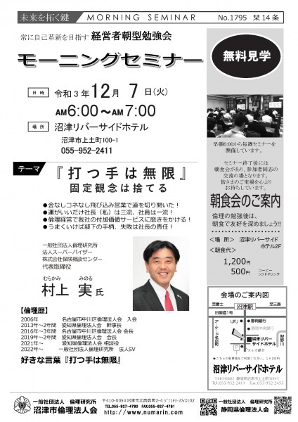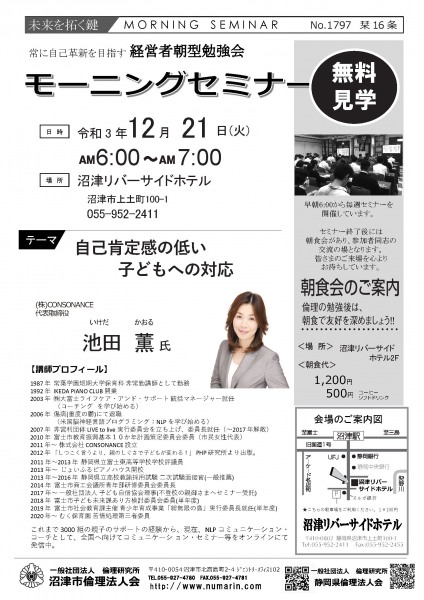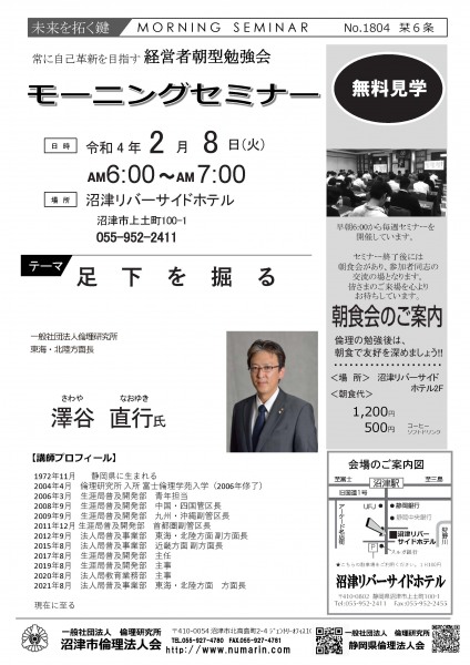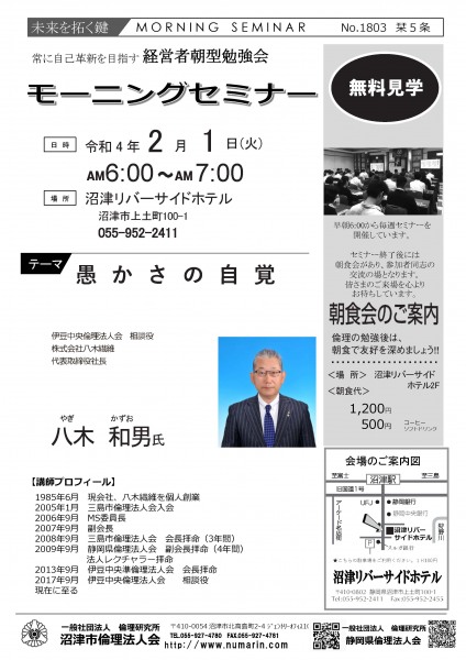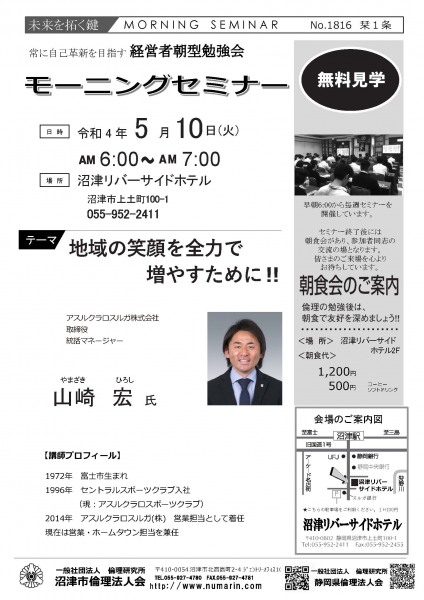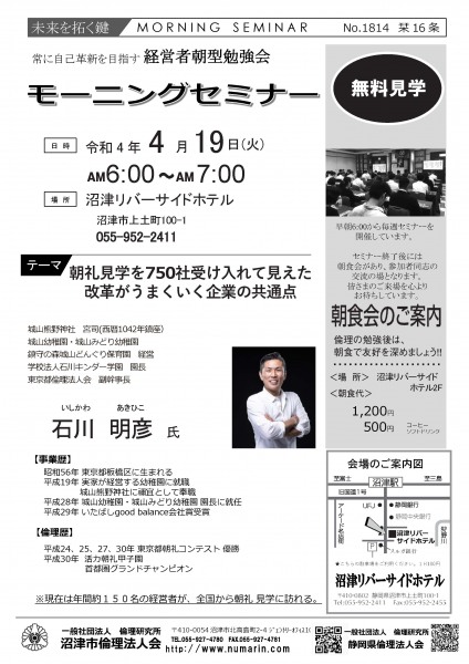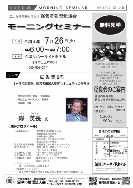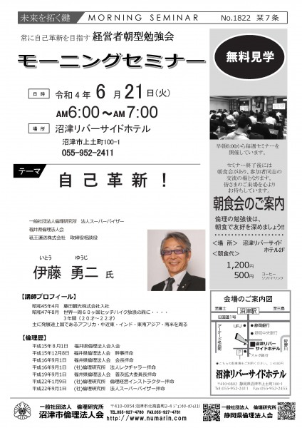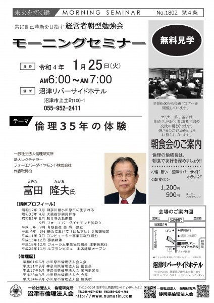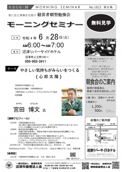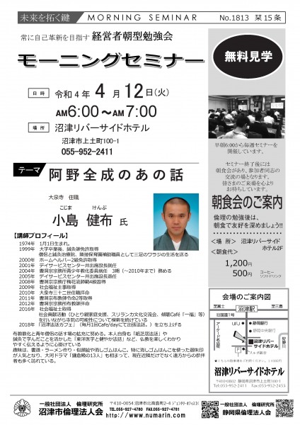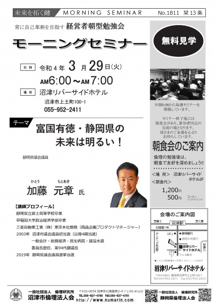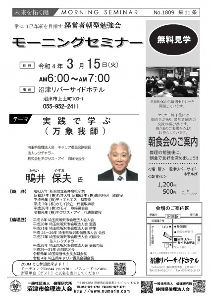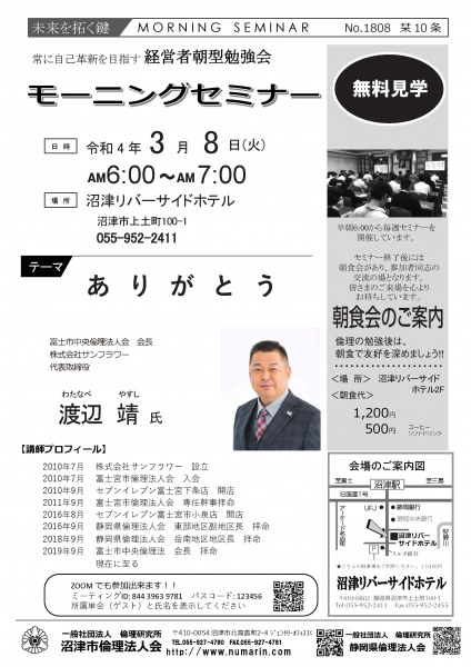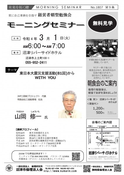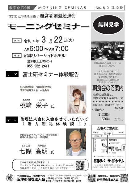 | 03月22日 | 桃崎栄子 七條高明 氏 | 沼津市倫理法人会 幹事 富士研セミナー体験報告/活力朝礼体験談! |