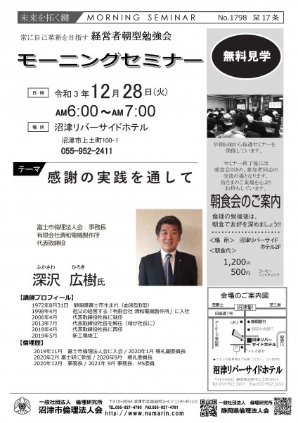 | 12月28日 | 深沢 広樹 氏 | 富士市倫理法人会 事務長、(有)清和電機製作所 代表 感謝の実践を通して |