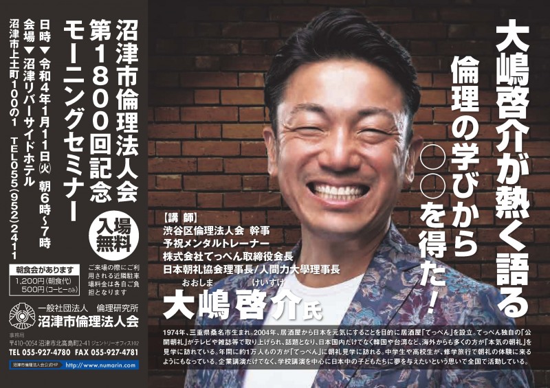 | 01月11日 | 大嶋啓介 氏 | 渋谷区倫理法人会 幹事、株式会社てっぺん取締役会長 第1800回記念!倫理の学びから○○を得た!! |