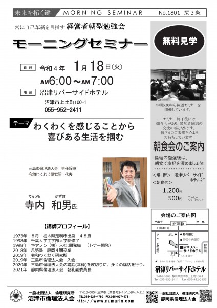 | 01月18日 | 寺内 和男 氏 | 三島市倫理法人会 専任幹事、令和わくわく研究所 代表 わくわくを感じることから、喜びある生活を掴む |