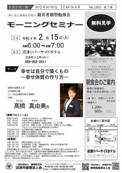 | 02月15日 | 高橋 真由美 氏 | 静岡市倫理法人会 幹事 幸せは自分で築くもの~幸せの体質の作り方~ |