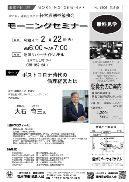 | 02月22日 | 大石 育三 氏 | 富士市倫理法人会 相談役 ポストコロナ時代の倫理経営 |