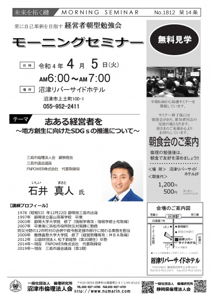 | 04月05日 | 石井 真人 氏 | 三島市倫理法人会 副事務長、三島市議会議員 志あり経営者を~地方創生に向けたSDGsの推進について~ |