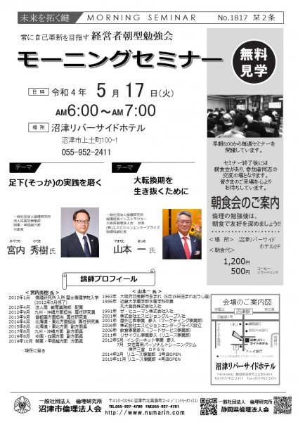 | 05月17日 | 宮内秀樹/山本一 氏 | 関東・甲信越方面 方面長/倫理経営インストラクター 足下(そっか)の実践を磨く/大転換期を生き抜くためんに |
