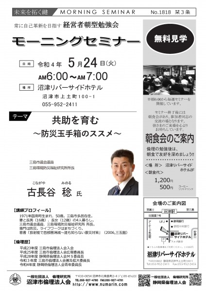 | 05月24日 | 古長谷 稔 氏 | 静岡県倫理法人会 青年委員長 共助を育む~防災玉手箱のススメ~ |