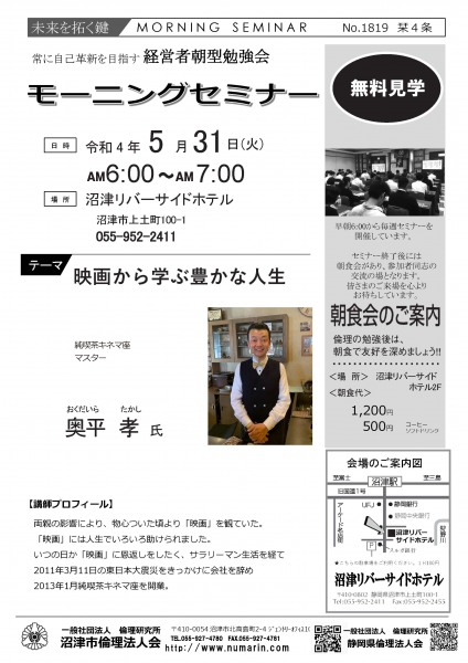 | 05月31日 | 奥平 孝 氏 | キネマ座 オーナー 映画から学ぶ豊かな人生 |