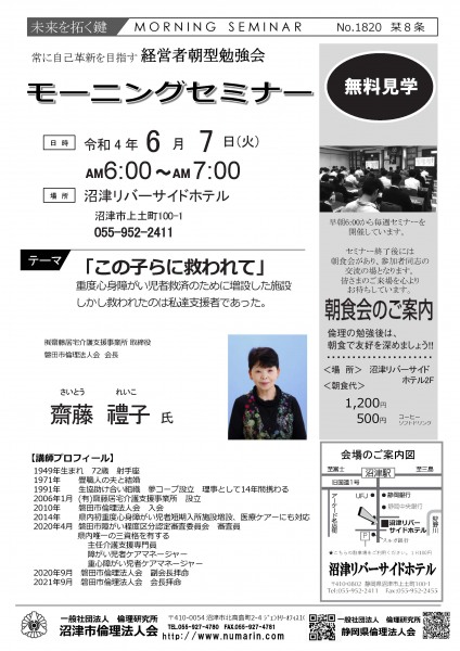 | 06月07日 | 齋藤 禮子 氏 | 磐田市倫理法人会 会長、(有)齋藤居宅介護支援事業所 「この子らに救われて」 重度心身障がい児者救済のために増設した施設しかし救われたのは私達支援者だった |