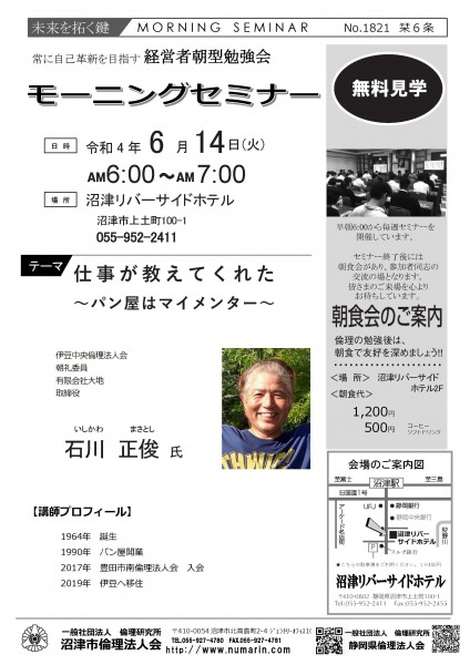 | 06月14日 | 石川 正俊 氏 | 伊豆中央倫理法人会 朝礼委員、(有)大地 仕事が教えてくれた ~パン屋はマイメンター~ |