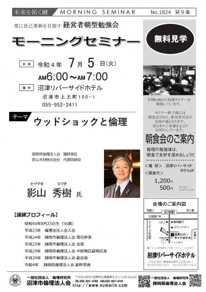 | 07月05日 | 影山 秀樹 氏 | 静岡県倫理法人会 副幹事長、影山木材株式会社 代表取締役社長 ウッドショックと倫理 |