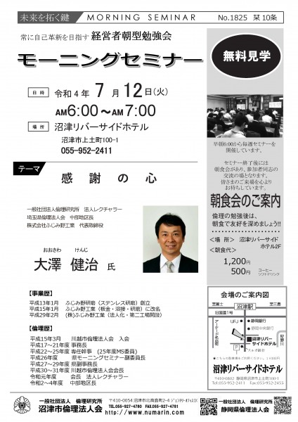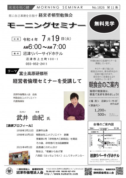 | 07月19日 | 武井 由紀 氏 | 有限会社ユメクリエイド 代表取締役、沼津市倫理法人会 会員 富士研セミナー体験報告 |