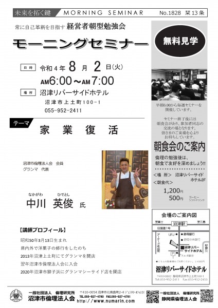 | 08月02日 | 中川 英俊 氏 | 沼津市倫理法人会 会員、グランマ 代表 家業復活 |