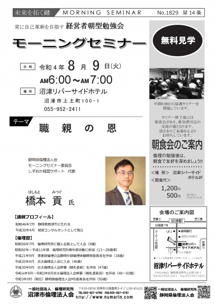| 08月09日 | 橋本 貢 氏 | 静岡県倫理法人会 MS委員長、しずおか経営サポート 職親の恩 |