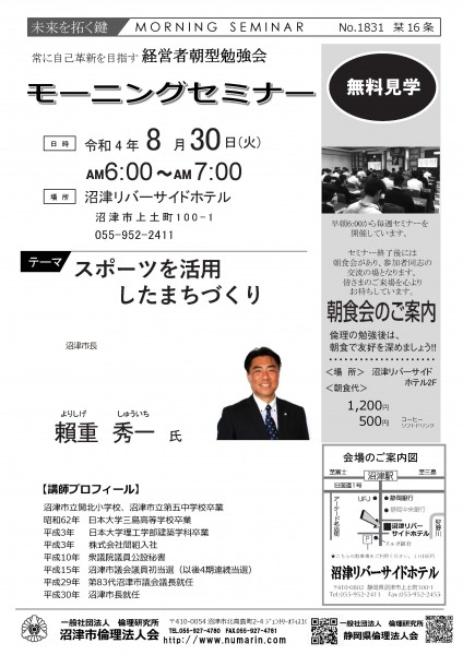 | 08月30日 | 頼重 秀一 氏 | 沼津市長 スポーツを活用したまちづくり |