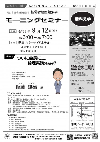| 09月12日 | 後藤 譲治 氏 | 沼津北倫理法人会 令和6年度会長 ついに会長に…。倫理実践Stage② |