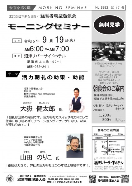 | 07月02日 | 中川 泰典 氏 | 静岡県倫理法人会 幹事長、遠州工機株式会社 代表取締役 私に万人幸福の栞とモーニングセミナー |