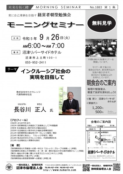 | 09月26日 | 長谷川 正人 氏 | 株式会社ゆたかカレッジ インクルーシブ社会の実現を目指して |