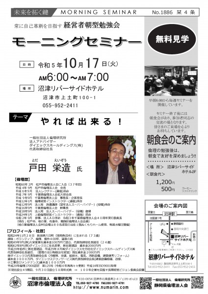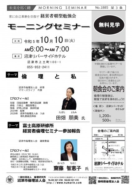 | 10月10日 | 田畑朋美、齋藤智惠子 氏 | 沼津市倫理法人会 幹事、運営委員 倫理と私/令和5年7月開催 富士高原研修所 経営者倫理セミナー参加報告 |