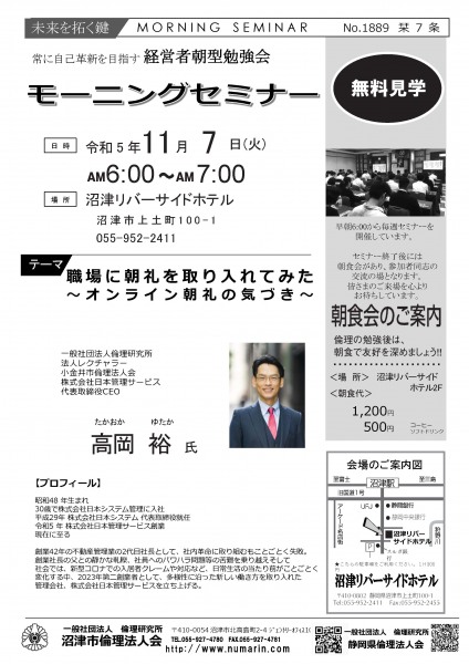 | 11月07日 | 高岡 裕 氏 | 法人レクチャラー 職場に朝礼を入れてた~オンライン朝礼の気づき~ |