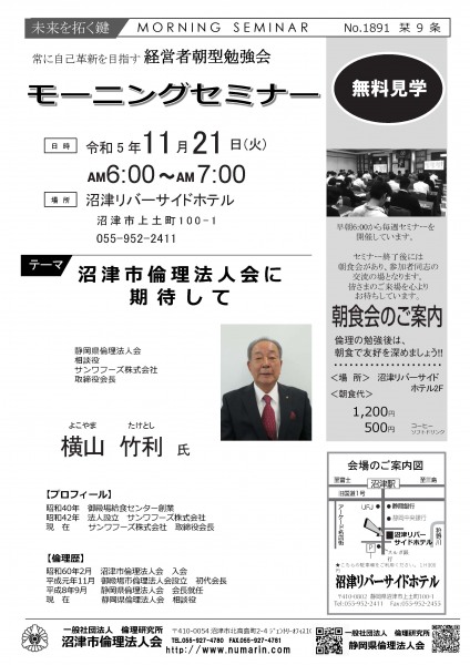 | 11月21日 | 横山 竹利 氏 | 静岡県倫理法人会 相談役 沼津市倫理法人会に期待して |