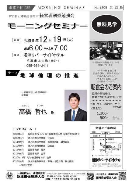 | 12月26日 | 西村嘉洋 氏 | 沼津市倫理法人会 朝礼委員、宅配クック1・2・3 沼津三島店 祖先と倫理のおかげ |