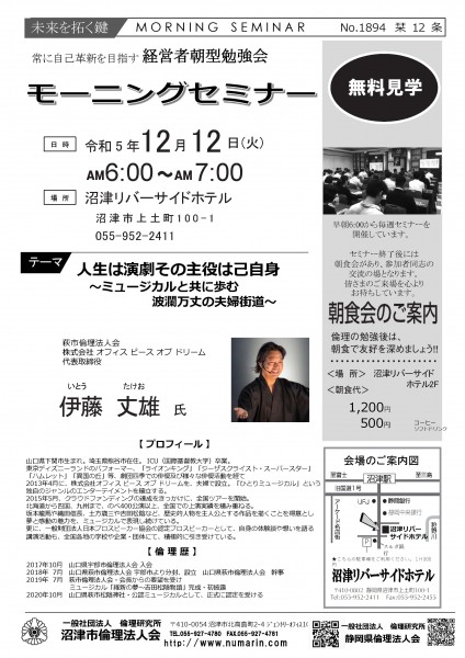 | 12月12日 | 伊藤 丈雄 氏 | (株)オフィスピース オブ ドリーム、萩市倫理法人会 会員 人生は演劇 その主役は己自身 ミュージカルと共に歩む、波瀾万丈の夫婦街道 |