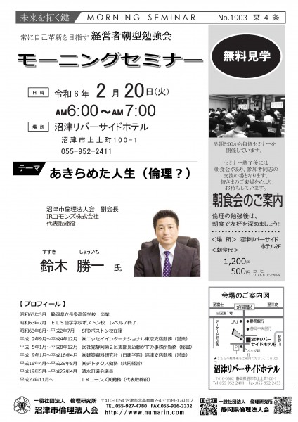 | 02月20日 | 鈴木 勝一 氏 | 沼津市倫理法人会 副会長、IRコモンズ(株)代表取締役 あきらめた人生(倫理?) |