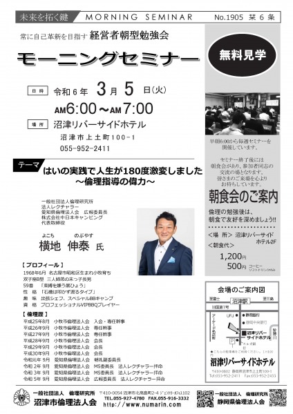 | 03月05日 | 横地 伸泰 氏 | 法人レクチャラー、(株)中日本キャンピング 代表取締役 はいの実践で人生が180度激変しました~倫理指導の偉力~ |