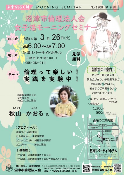 | 03月26日 | 秋山 かおる 氏 | 静岡県倫理法人会 女性委員長、(株)秋山建設 倫理って楽しい!実践を実験中 |