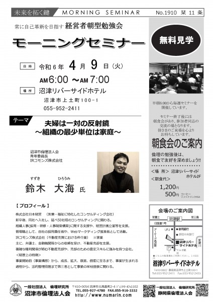 | 04月09日 | 鈴木 大海 氏 | 沼津市倫理法人会 青年委員、IRコモンズ(株) 夫婦は一対の反射鏡~組織の最小単位は家庭~ |