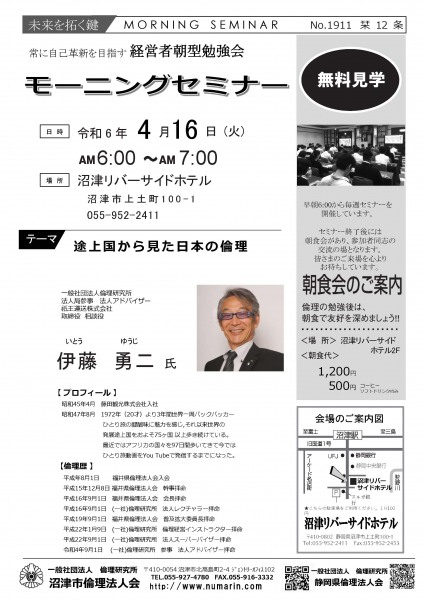| 04月16日 | 伊藤勇二 氏 | 法人アドバイザー、祇王運送(株)取締役相談役 途上国から見た日本の倫理 |