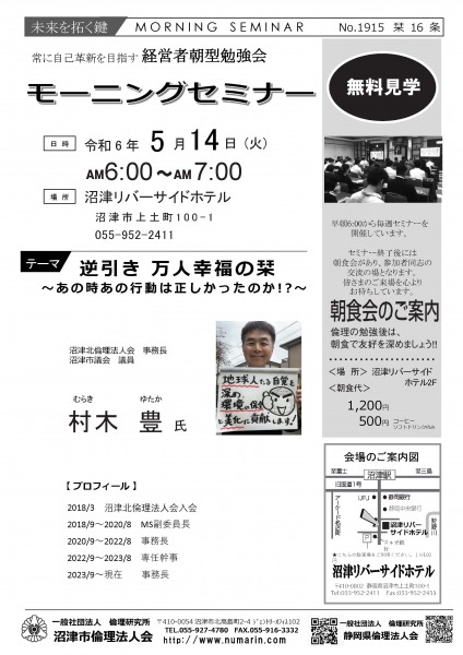 | 05月14日 | 村木 豊 氏 | 沼津北倫理法人会 事務長、沼津市議会議員 逆引き 万人幸福の栞~あの時のあの行動は正しかったのか!?~ |