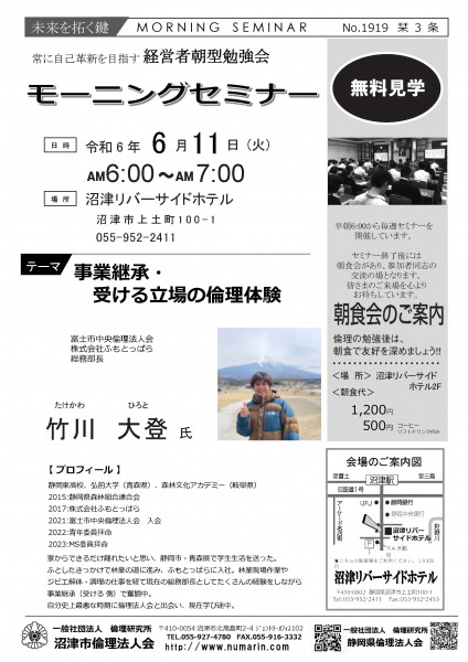 | 06月11日 | 竹川 大登 氏 | 富士中央倫理法人会 会員、(株)ふもとっぱら 総務部長 事業継承・受ける立場の倫理体験 |