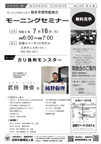 | 07月16日 | 武田 勝俊 氏 | 富士市倫理法人会、株式会社 広宣社 代表取締役 ガリ我利モンスター |