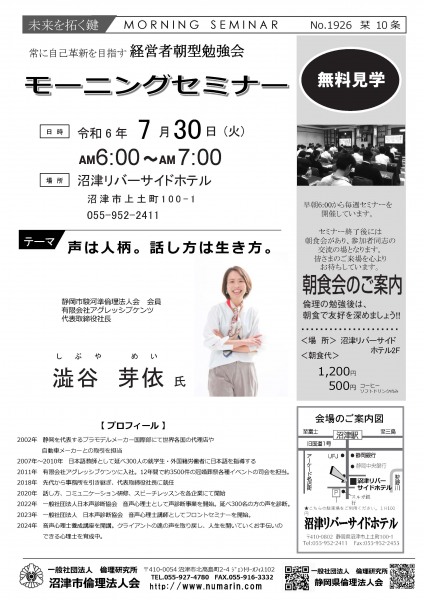 | 07月30日 | 澁谷 芽依 氏 | 静岡市駿河準倫理法人会、有限会社アグレッシブケンツ 代表取締役 声は人柄。話し方は生き方。 |