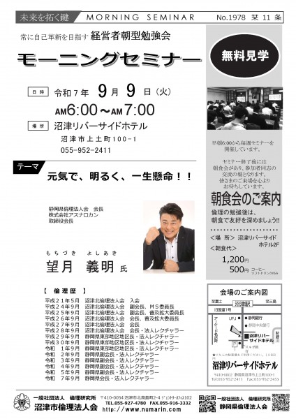 | 09月09日 | 望月 義明 氏 | 静岡県倫理法人会 令和8年度 会長 元気で、明るく、一生懸命! |