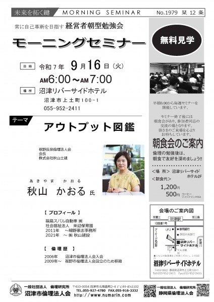 | 09月16日 | 秋山 かおる 氏 | 裾野市倫理法人会 R8年度 会長、(株)秋山建設 アウトプット図鑑 |
