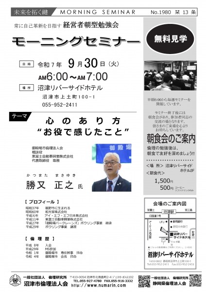 | 09月30日 | 勝又 正之 氏 | 御殿場市倫理法人会 R7年度 会長、東富士自動車興業株式会社、代表取締役 専務 心のあり方”お役で感じたこと” |
