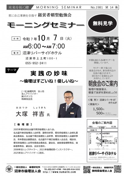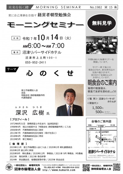 | 10月14日 | 深澤 広樹 氏 | 富士市倫理法人会 会長、有限会社清和電機製作所 代表取締役 心のくせ |