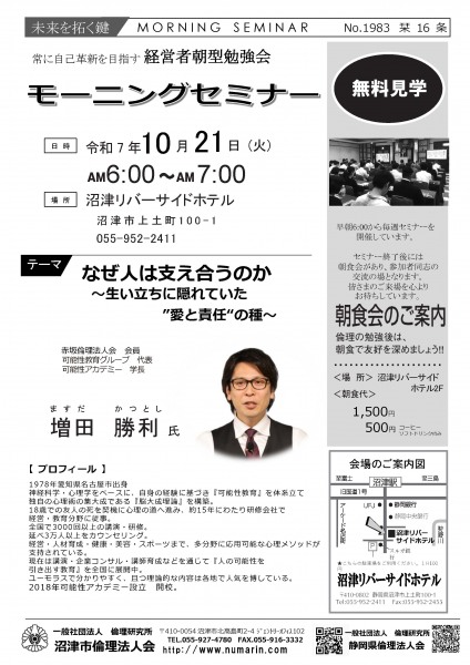 | 10月21日 | 増田 勝利 氏 | 赤坂倫理法人会 、可能性教育グループ 代表 なぜ人は支え合うのか~生い立ちに隠れていた“愛と責任”の種 |