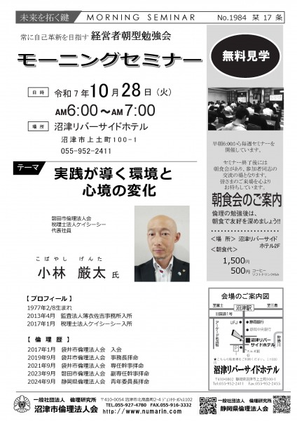 | 10月28日 | 小林 厳太 氏 | 磐田市倫理法人会、税理士法人ケイシーシー 代表社員 実践が導く環境と心境の変化 |