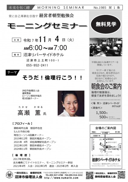 | 11月04日 | 高瀬 薫 氏 | 浜松市倫理法人会 運営委員、ローソン磐田天竜店 他3店舗オーナー そうだ!倫理行こう |