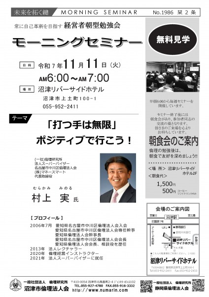 | 11月11日 | 村上 実 氏 | 名古屋市中川区倫理法人会、(株)マネースマート 代表取締役 「打つ手は無限」 ポジティブで行こう! |